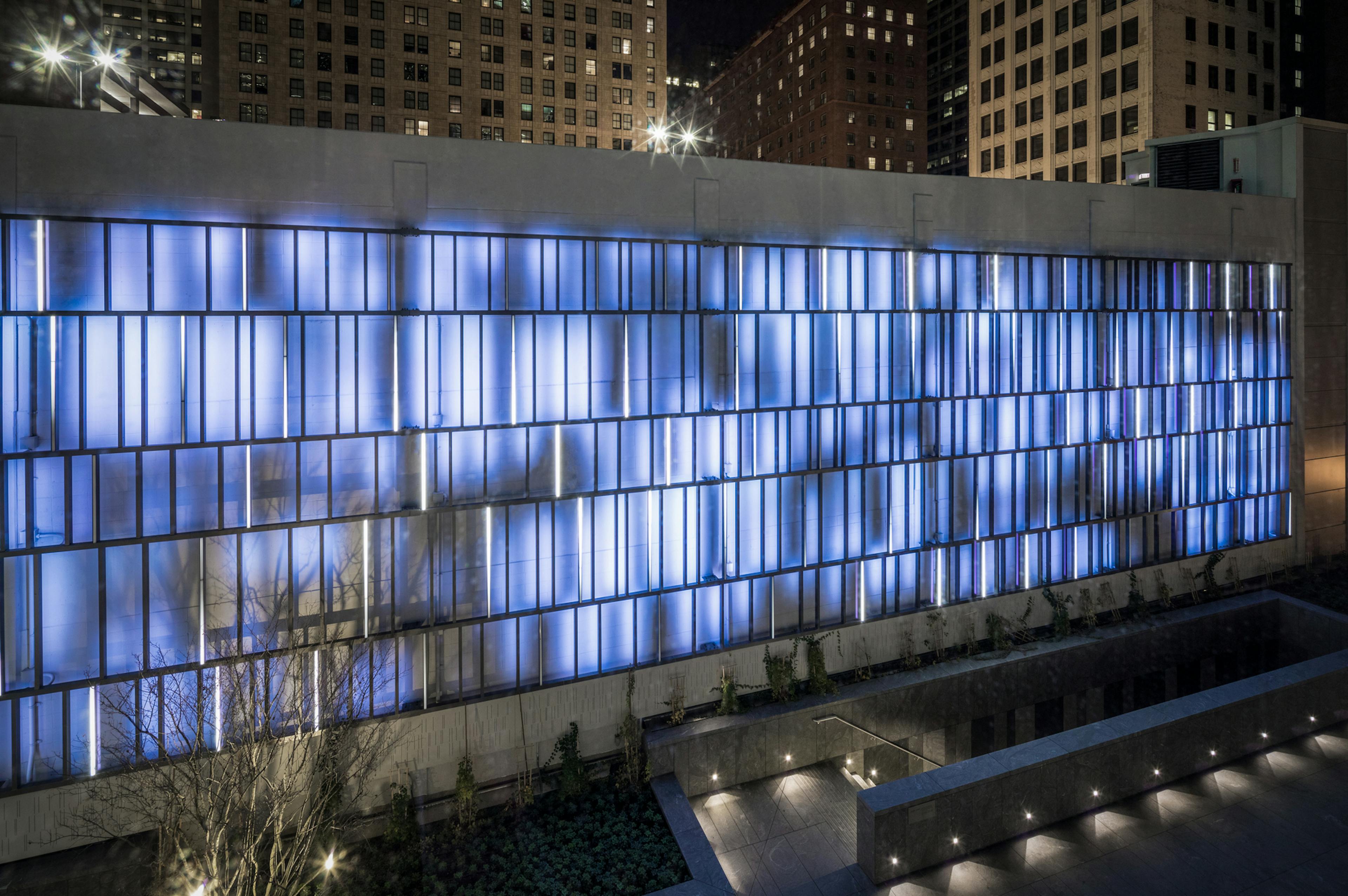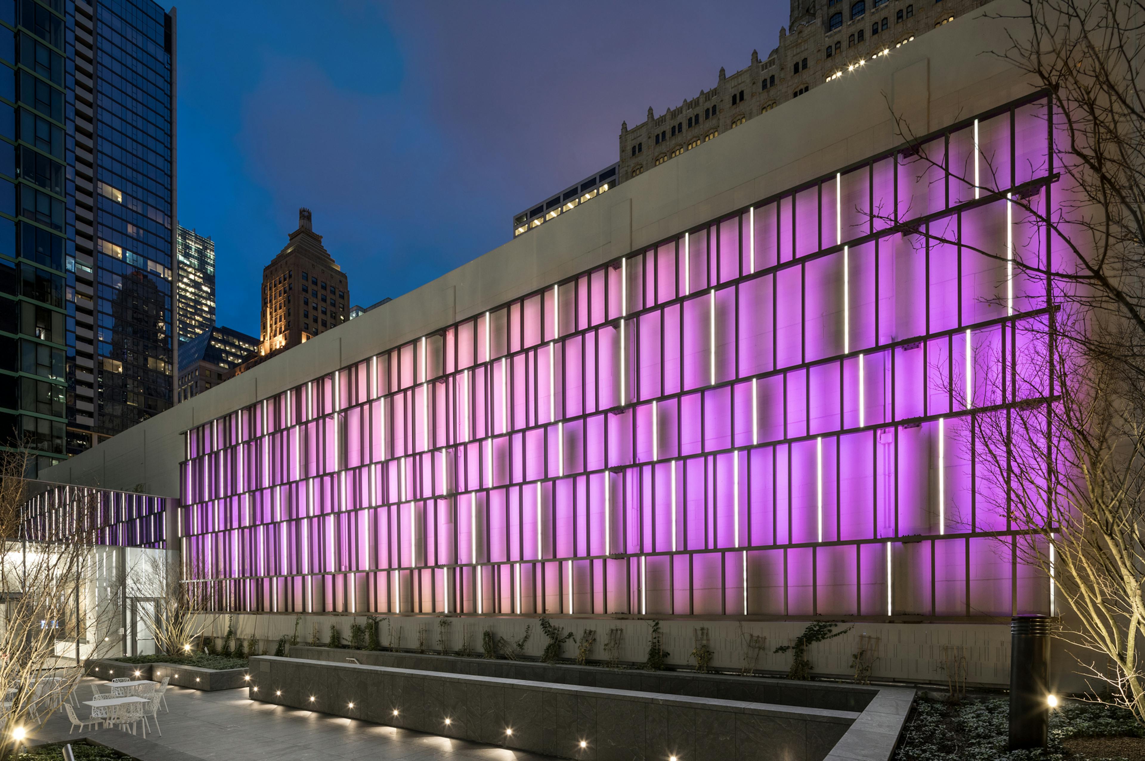 The dynamic light installation at 151 North Franklin uses gentle movement and dappled light to create an organic and contemplative feeling in the building’s second floor garden terrace. A “trellis” of vertical light bars and brushed metal fins, the textured structure plays dynamically with animation and light for an experience that’s part digital, part nature.