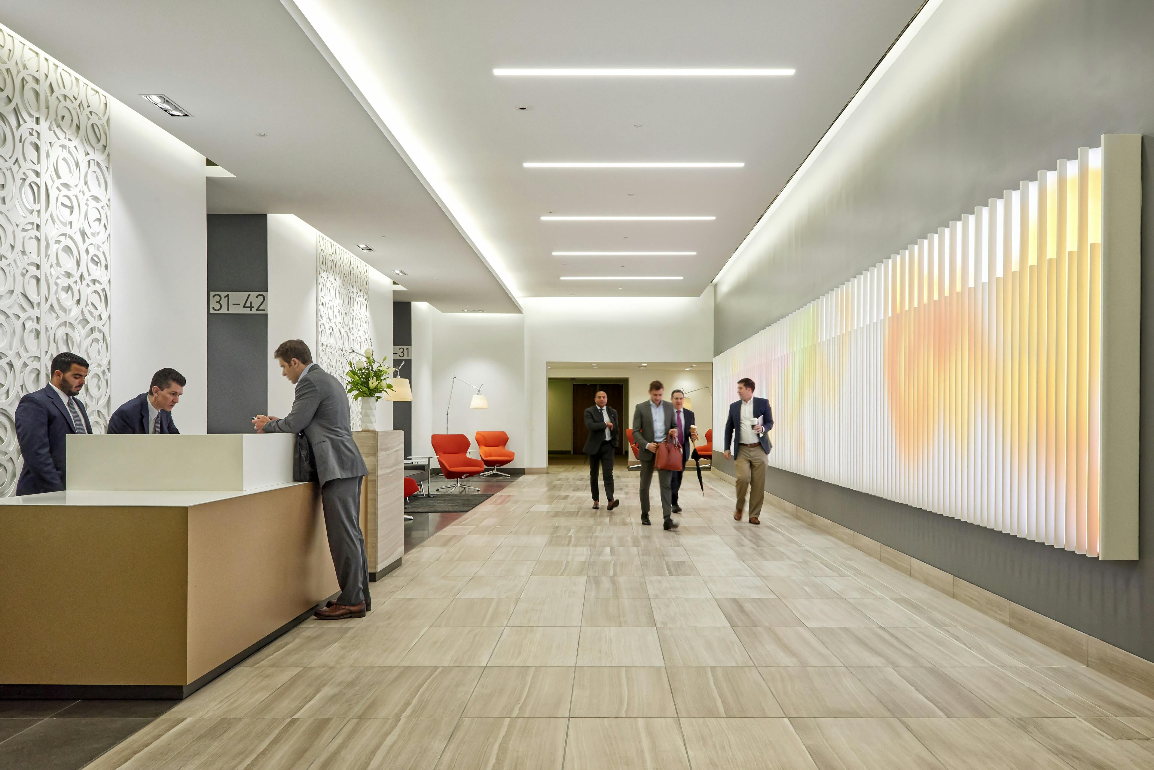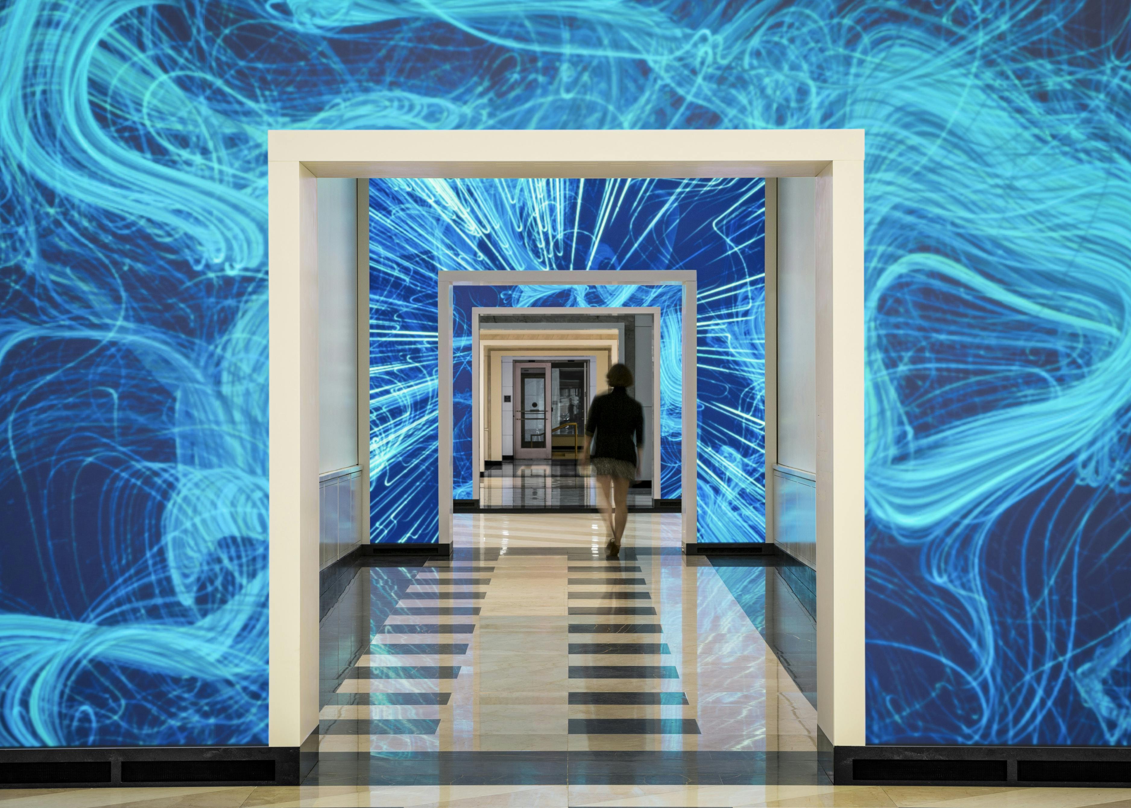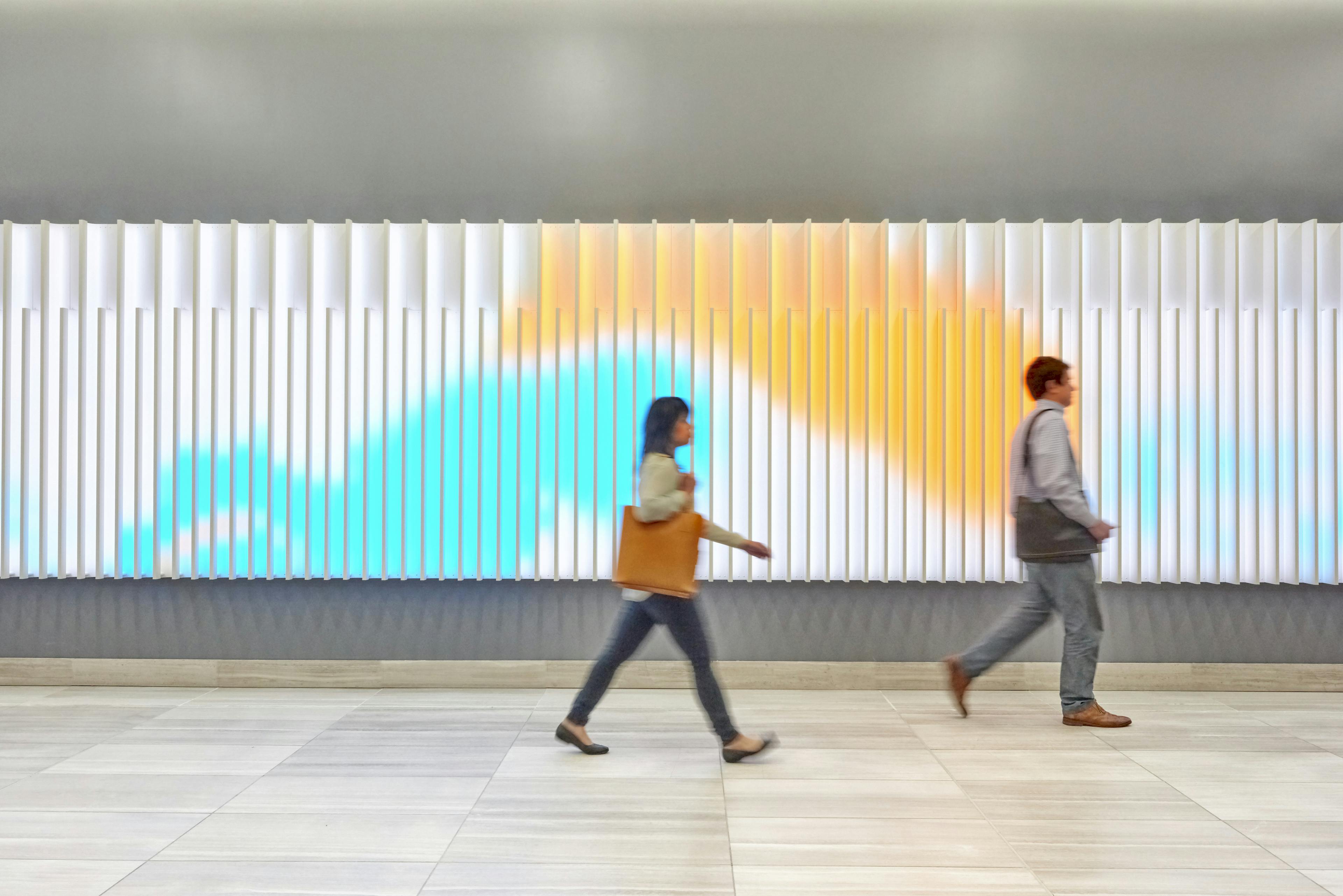 Merging vivid hues, light and textures, five motion-activated sensors track visitors; as more people fill the lobby, the horizontal canvas captures this energy, becoming livelier and more colorful. The result is a “crowdsourced” expressive media installation befitting tenants in creative, tech and traditional industries alike.