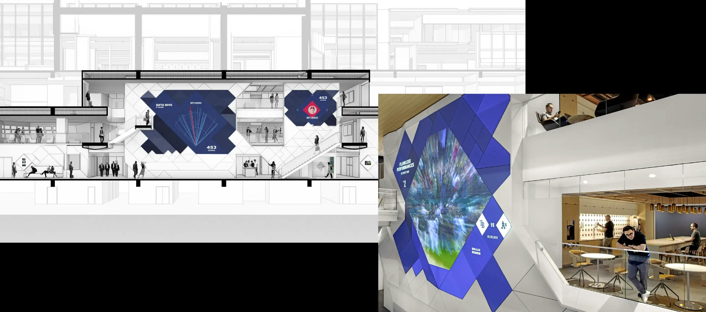 During the season, a large-scale projection-mapped custom media display in the central three-story concourse features the latest game highlights, algorithmically wrapped in an animated frame. Custom data visualizations and slide shows of classic imagery and game footage intercut the highlights, keeping the media active during the off season.