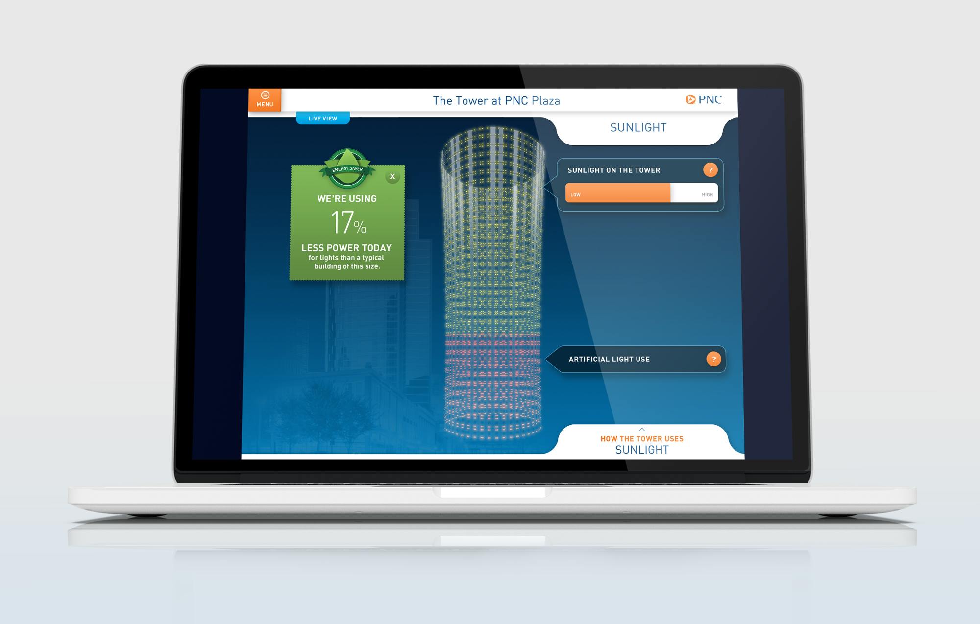At PNC Tower, designed to be the greenest office tower in the world, ESI devised a way to communicate environmental impact. “The Beacon,” a data-and-light media installation in the atrium lobby, interprets data from the building’s advanced green systems and the external environment, then translates it into ever-changing patterns of light, color and sound.