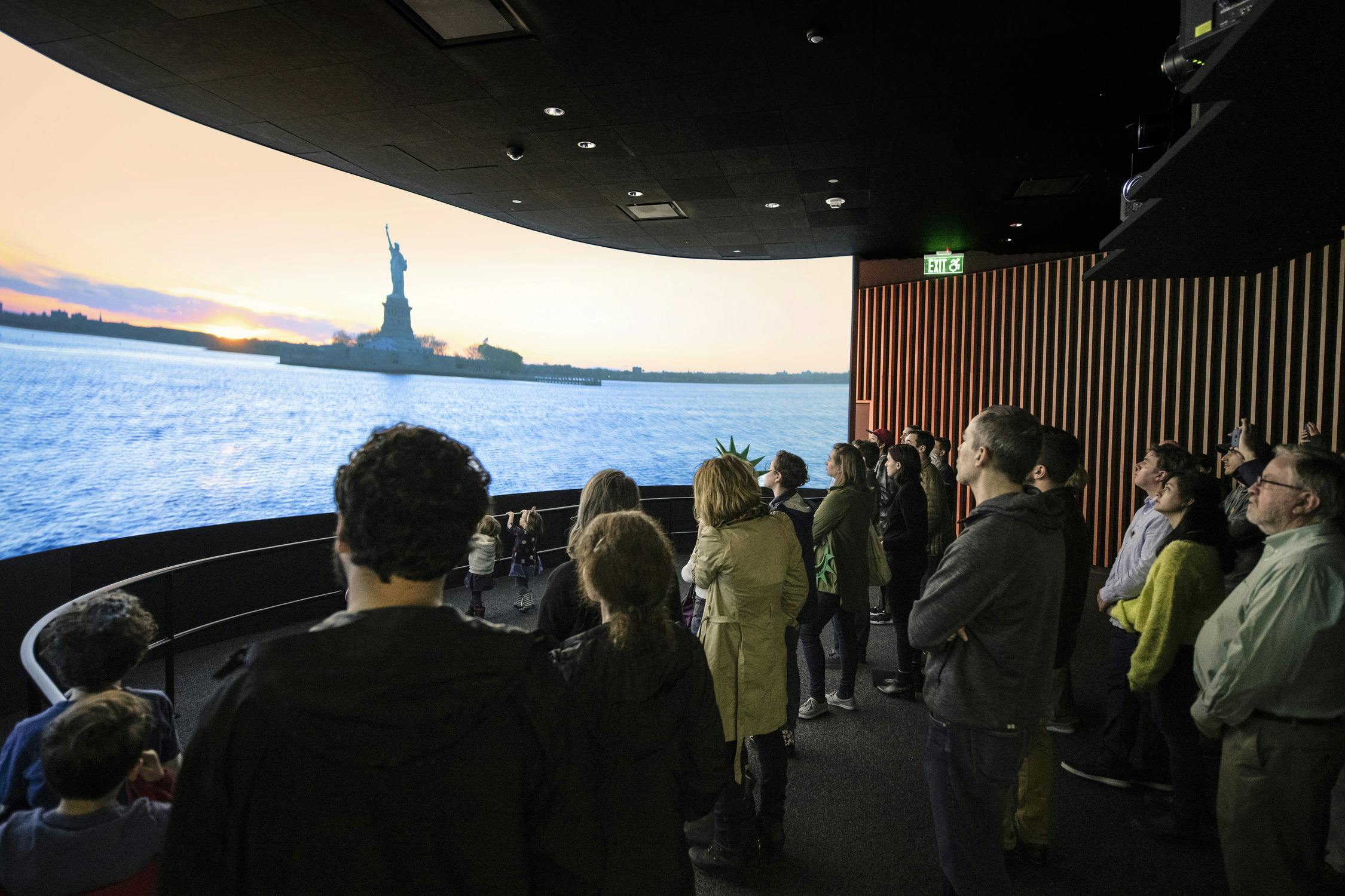 The cinematic journey begins in the immersive theater, where curved screens feature drone footage, archival imagery and motion graphics that educate visitors about the people and stories shaped by the statue.