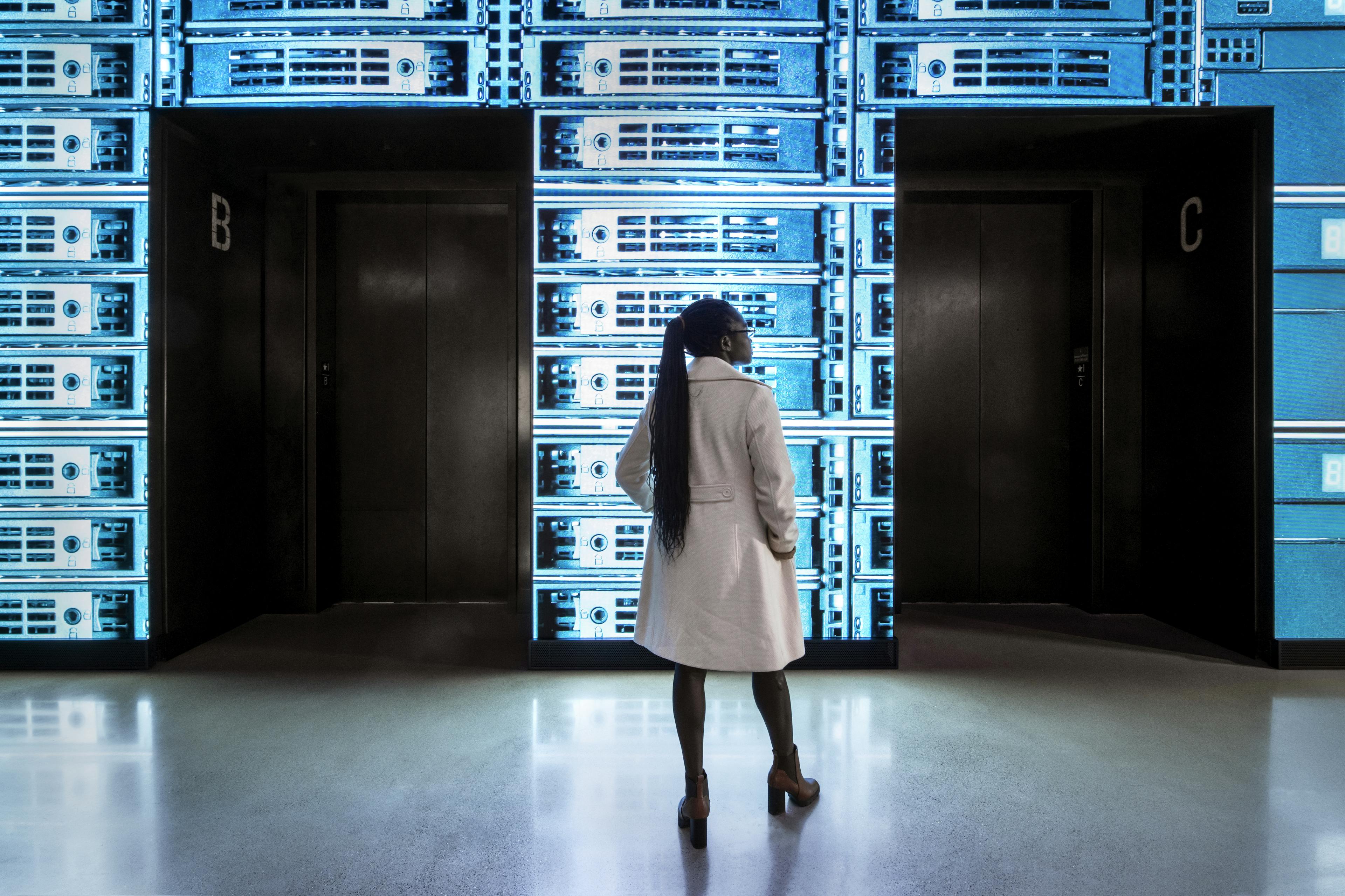 Sensor data from people entering and leaving the Hub is visualized as white orbs moving in unique, choreographed patterns across the skybox canopy, symbolizing collective ingenuity.