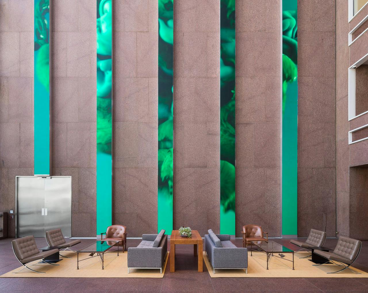 To refresh the building’s dramatic eight-story, light-filled glass lobby and restore its prominence, ESI created five 85-foot-tall LED columns that rise through the space, forming the largest piece of public art in Denver. Developed in close collaboration with the city to bring this ambitious vision to life, the installation uses unique algorithms to create nature-inspired animations drawn from Colorado’s diverse landscapes that change due to current weather conditions. Digital birds—3,600 that never fly the same way twice—traverse a luminous blue sky, while immersive landscape mosaics feature artistic images from local Instagram users.